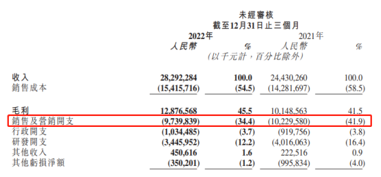 财报数据显示,快手四季度销售及营销开支同比下降4.8%至97亿元,占总收入比从2021年同期的41.9%下降至2022年四季度的34.4%。上市后,该比例首次低于35%。