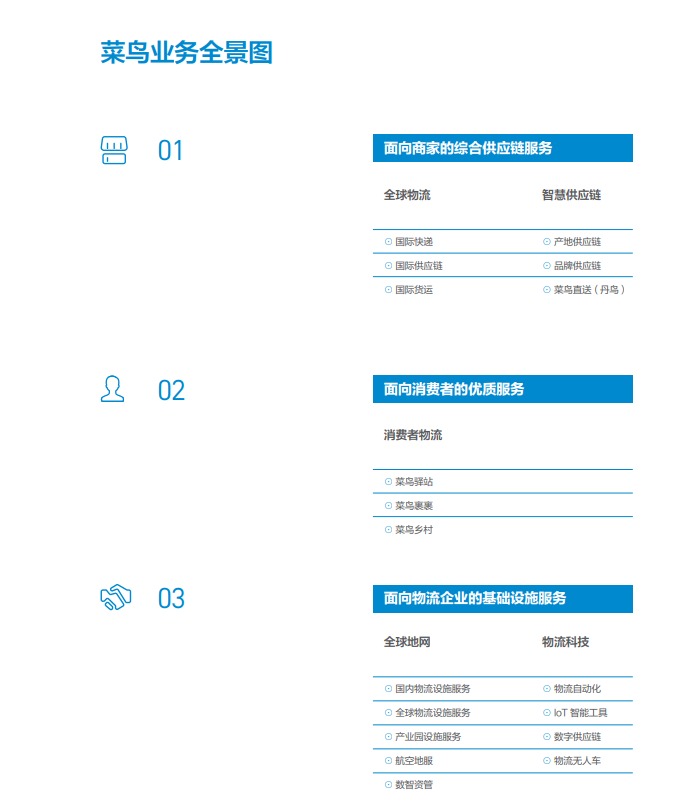 菜鸟,成立于 2013 年,作为一家客户价值驱动的全球化产业互联网公司,目前已形成面向商家、消费者和物流合作伙伴3类客户的5大核心服务板块:全球物流、智慧供应链、消费者物流、全球地网和物流科技。菜鸟致力于做一家服务国计民生的好公司,用扎实的物流能力服务国家战略和经济社会发展大局。