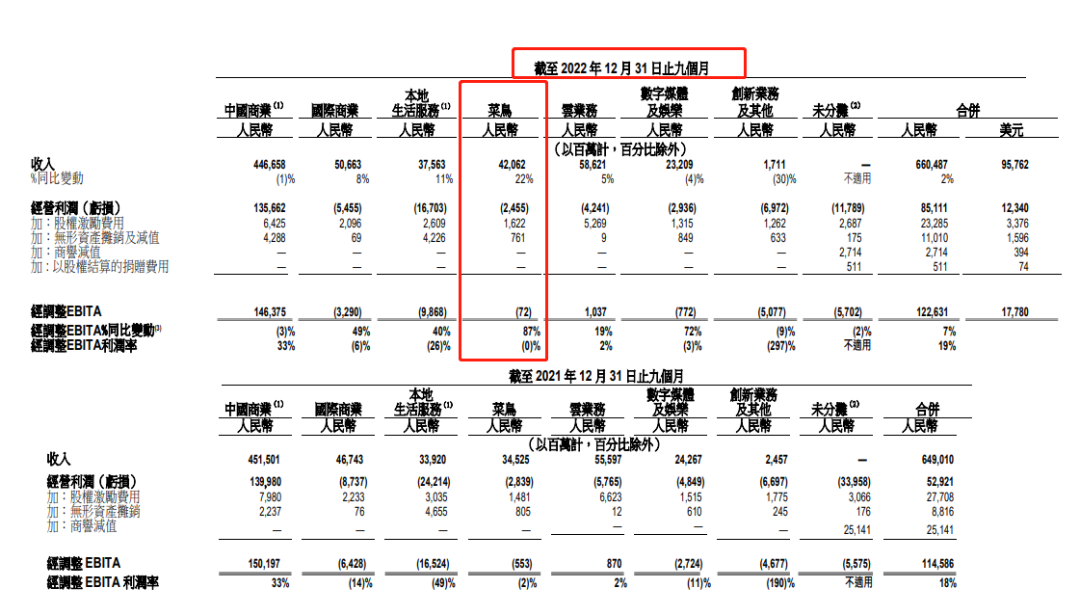 根据阿里巴巴在今年2月23日阿里巴巴的业绩公告(截至2022年12月31日的最近财年首九个月),可以发现「菜鸟」在最新财年的首九个月收入420.62亿元人民币、占阿里巴巴总收入6.4%,按年增长22%,经调整EBITA为亏损7200万元人民币。