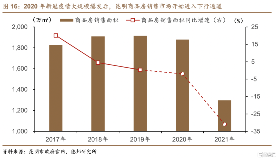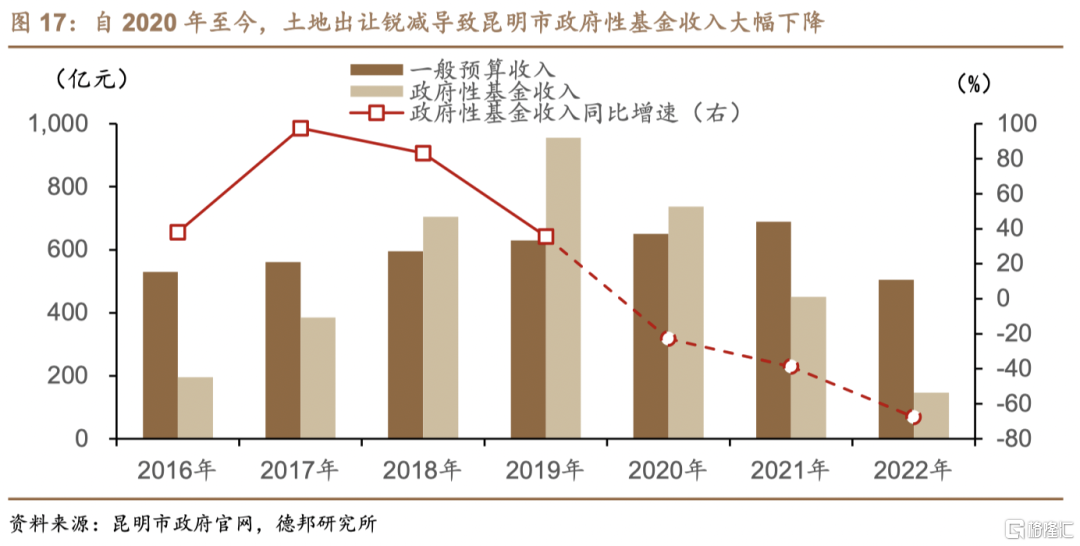 自2020年至今,地产市场不景气导致昆明市土地出让不畅,当地政府对城投平台的支持能力有所弱化,最终部分城投陷入流动性困境导致区域城投融资环境整体恶化。自2017年至2019年,伴随旅游资源的不断挖掘、交通条件的持续完善、全国房地产市场热度增加,昆明市商品房销售面积逐年增长。在房地产市场较为火热的带动下,昆明市政府性基金收入自2016年的194.95亿元以年均70%的增速快速攀升至2019年的955.79亿元,仅用时两年便完成对当地一般公共预算收入的反超。在房地产投资带动区域经济增长的同时,商品房热销促使土地出让成为昆明市财政最重要的增收渠道。进入2020年,伴随新冠疫情对旅游业的打击,昆明市商品房销售面积小幅下行近2%,房地产市场“熄火”直接导致当地新增土地出让不畅,当年政府性基金收入下降超过20%。自2021年至2022年,由于新冠疫情持续、旅游业景气度长期低迷、国内地产行业整体下行等多重因素的打击,昆明市政府性基金收入降幅逐年扩大,2022年当地仅实现政府性基金收入146.1亿元,与2015年141.2亿元的收入水平大体相当,同比下降67.6%,跌幅创近7年来最高纪录。在“土地财政”被削弱的同时,土地出让不畅也使得昆明城投平台账面土地资产的市场估值有所下降,最终昆明市少数城投陷入流动性困境导致区域融资环境整体恶化。