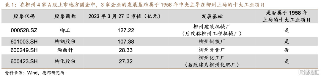 1958年新中国在柳州兴建柳州钢铁厂、柳州动力机械厂等十大工业项目,这些国有工业企业最终演化为如今柳州市汽车、钢铁、机械3大传统支柱产业。早在1928年,新桂系军阀平定广西后,便在柳州建立了柳江机械厂以发展军工,该厂是日后柳州机械厂的前身,也是柳州工业基础的起源,曾经成功生产了广西历史上的第一架汽车与战斗机。新中国成立后,为扶持广西这一少数民族地区的经济发展,中央和广西两级政府拟将具有工业基础的柳州建设成为广西新兴工业城市,并以发展重工业为主。因此1958年中央和广西确定在柳州兴建十大工业项目,具体包括柳州钢铁厂、柳州动力机械厂、柳州化工厂、柳州建筑机械厂等。其中,①柳州钢铁厂于1966年成为广西最大的钢铁联合企业;②柳州建筑机械厂日后发展成为柳工集团,是我国工程机械行业及广西第一家上市公司。