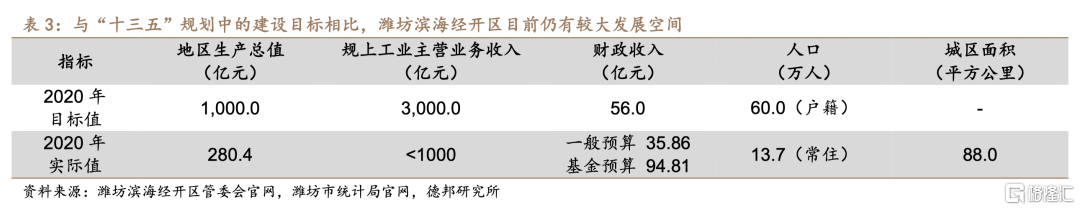 在潍柴、歌尔等传统龙头企业带动潍坊高新区发展的同时,潍坊规划了滨海经开区,以“向北向海向未来”为指引发展海洋经济,培育区域经济新的增长极。自1992年潍坊高新区获批成为国家级园区后,潍柴、歌尔等传统龙头企业持续带动潍坊高新区经济发展,后者逐步进入发展成熟期。为培养新的区域经济增长极,2005年潍坊滨海经开区获准成立并于2010年升格为国家级园区,旨在重点发展海洋动力装备、海洋化工、海洋医药等海洋经济。在2016年滨海经开区发布的 “十三五”规划中,其确立了2020年争取实现GDP1000亿元、地方财政收入56亿元、规模以上工业主营业务收入3000亿元、户籍人口达到60万人的发展目标。但从实际落实情况上看,2020年滨海经开区虽然依靠土地出让收入(含国企拿地)完成了地方财政收入目标,但同期GDP仅实现280.4亿元、人口仅为13.67万人,而规模以上工业主营业务收入更是直至2022年才首次突破1000亿元,实际发展速度不及预期。