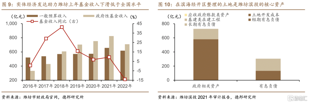 潍坊滨海经开区发展速度不及预期最终传导为相关城投的账面土地资产难以迅速变现,当区域城投再融资因债务管理不善而趋于收窄时,公司流动性日益紧张。对经开区的核心建设主体-潍坊滨海投资发展有限公司(简称“潍坊滨投”)而言,2021年末,公司负债总规模达364亿元,其中有息负债规模约为306亿元,具体包括短期有息负债约134亿元、长期有息负债约172亿元。与有息负债对应的是,公司资产总规模达846亿元,其中应收政府账款类资产合计达187万元、规模较小,土地开发成本约581亿元,基建类在建工程约147亿元,三类资产合计达728亿元,对公司有息负债的覆盖比例约为238%。换言之,公司举借的债务大多流入土地开发及基建业务,形成了经开区的实物资产,当区域城投再融资因债务管理不善而趋于收窄时,城投账面土地资产因经开区发展速度有待提高而短期内难以变现加剧了公司的流动性紧张。