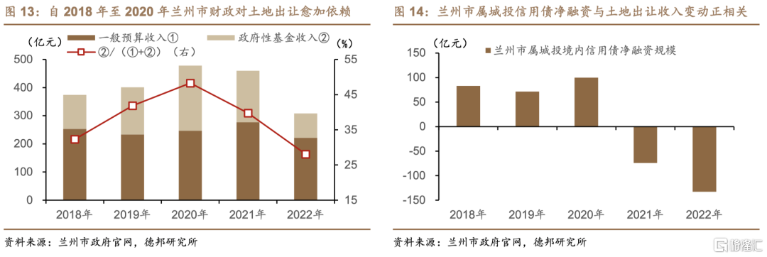 虽然兰州“土地金融”的具体融资规模尚无准确数据公开,但从当地“土地财政”的规模上,外界可对土地资源对兰州融资的重要性有所感知。自2018年至2020年,兰州市一般公共预算收入维持在230-255亿元,历年增长幅度较小,但同期全市政府性基金收入由121亿元年均增长38%至231亿元,特别是国有土地使用权出让收入实现了快速增长。也正是在这一阶段,兰州市属城投平台依托土地出让增加带来的地方财力增长,争取偏好“弱区域核心城投”的债券投资人投资,债券融资规模快速抬升。自2018年初至2020年末,兰州市属城投平台的境内存量信用债规模由95.6亿元攀升至350.1亿元,增速高达266%。但2021年受国内房地产行业整体下行影响,地方政府的土地出让受到一定冲击,以兰州为代表的中西部弱资质城市受冲击尤为明显,当地政府性基金收入由2020年的230.66亿元大幅下降63%至2022年的86.45亿元。与此同时,当地城投平台新增土地抵押融资的空间也因底层资产的市场认可度下降而大幅收窄,当地城投平台的资金链愈加紧绷,最终“19兰州城投PPN008”于2022年8月发生技术性违约。
