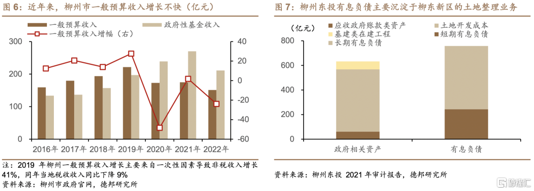 柳州市重点产业园区发展速度不及预期最终传导为相关城投难以快速出让账面土地资产,最终流动性陷入困境。对柳东新区的核心建设主体-广西柳州市东城投资开发集团有限公司(简称“柳州东投”)而言,2021年末,公司负债总规模达950亿元,其中有息负债规模约为757亿元,具体包括短期有息负债约243亿元、长期有息负债约514亿元。与有息负债对应的是,公司资产总规模达1370亿元,其中应收政府账款类资产合计达61亿元、土地开发成本约507亿元、基建类在建工程约64亿元,三类资产合计达632亿元,对公司有息负债的覆盖比例约为83%。换言之,公司通过有息负债举借的资金大多沉淀在一级土地整理业务中,主要是柳东新区的“熟地”。因柳东新区发展速度有待提高,公司难以快速出让账面土地资产,债务偿还依赖借新还旧及财政补助。当公司再融资渠道受负面舆情等多种因素而趋于收窄时,公司只能依赖政府协调财政资金或金融资源,自身资金周转压力相对较大。