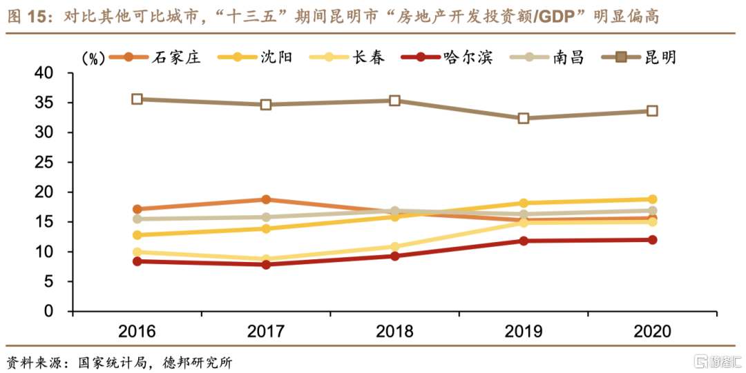 昆明市在“十三五”期间经济增长迅速,但GDP增长主要来自房地产投资带动,当地对制造业等实体支柱产业的培育稍显不足。2015年,昆明市GDP为3968亿元,在全国36个主要城市中居第25位;但经历“十三五”期间的发展后,2020年昆明市GDP已达到6734亿元,在全国36个主要城市中居第20位,反超沈阳、哈尔滨、长春、石家庄、南昌5个城市。从具体原因上看,自2016年至2020年,昆明市“房地产开发投资额/GDP”指标的均值达34%,明显高于其他城市不超过18%的同期水平,昆明市依托旅游等资源大力发展房地产业,相关投资成为带动昆明GDP增长的主要来源之一。但从同期第二产业增加值占GDP的比重上看,昆明市这一指标仅为35%,与GDP被反超的城市相比,该指标仅高于哈尔滨市,这在一定程度上反映出昆明市重点发展旅游、房地产的方针可能影响了当地对制造业等实体支柱产业的培育力度。最终自2021年国内房地产行业开始整体下行后,叠加疫情对旅游等依赖人员流动的产业造成冲击,昆明市GDP增速连续2年未能超过全国平均增速,经济发展势头减弱。