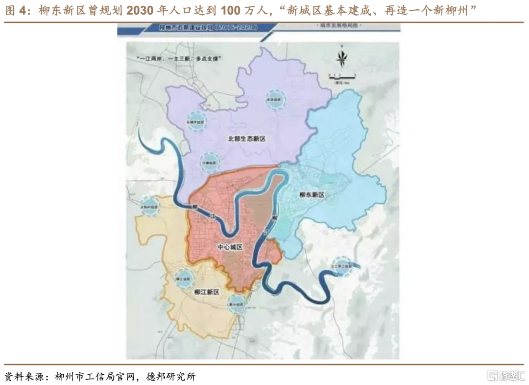 在园区工业化背景下,柳州市先后规划了柳东新区、北部生态城等11个产业园区,特别是柳东新区以建设柳州汽车城为核心,规划建设规模可“再造一个新柳州”。2007年柳州市挂牌成立柳东新区,次年与柳州高新区合并,2010年柳州高新区升格为国家级高新区后,广西自治区决定在柳东新区建设广西柳州汽车城,打造柳东以汽车工业为龙头的产业发展格局。在柳东新区的助力下,目前柳州已发展成为全国唯一同时有四大汽车集团整车生产基地的城市,即上汽通用五菱宝骏基地、东风柳汽乘用车及商用车柳东基地、广西汽车集团新能源汽车基地、一汽解放柳州整车基地。但在重点围绕汽车及周边产业建设柳东新区的同时,新区规划规模较大和产业培育有待提速的矛盾日益凸显。