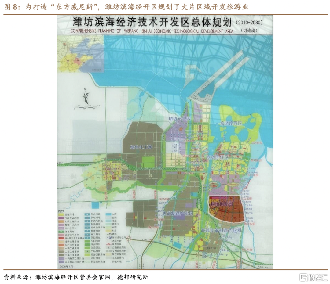 最后,潍坊滨海经开区规划到2035年建设用地达417.88平方公里、2020年末建成区面积达88平方公里,分别相当于2015年潍坊市辖区建成区面积(178平方公里)的2.35倍、49%,与2020年主城四区常住人口超过165万人但经开区常住人口不足15万人相比,经开区的起步建设节奏过快。同时,一方面经开区规划面积过大导致当地产业布局及人口分布较为分散,不利于商业等配套设施的集中修建,生活配套的不完善加大了人口引流的难度;另一方面经开区同时规划了以发展盐化工为主的工业区和以发展旅游为主的度假区,工业企业所带来的污染对旅游、康养等要求环境宜居的产业构成了先天障碍。
