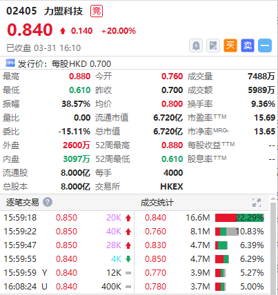 3月30日消息,跨境数字营销服务提供商力盟科技首日挂牌,收报0.84港元,较招股价0.7港元上升0.14港元或20%,高位0.88港元,低位0.61港元,成交7488万股,涉及金额5989万港元。 不计手续费及佣金,一手4000股赚560港元。