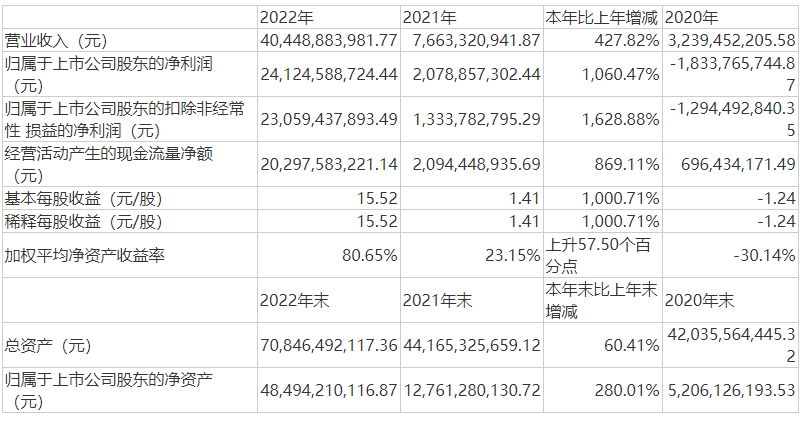 年报显示,天齐锂业2022年实现营业收入404.49亿元,同比增长427.82%;实现归母净利润241.25亿元,同比增1060.47%;基本每股收益15.52元,同比增长超过10倍。