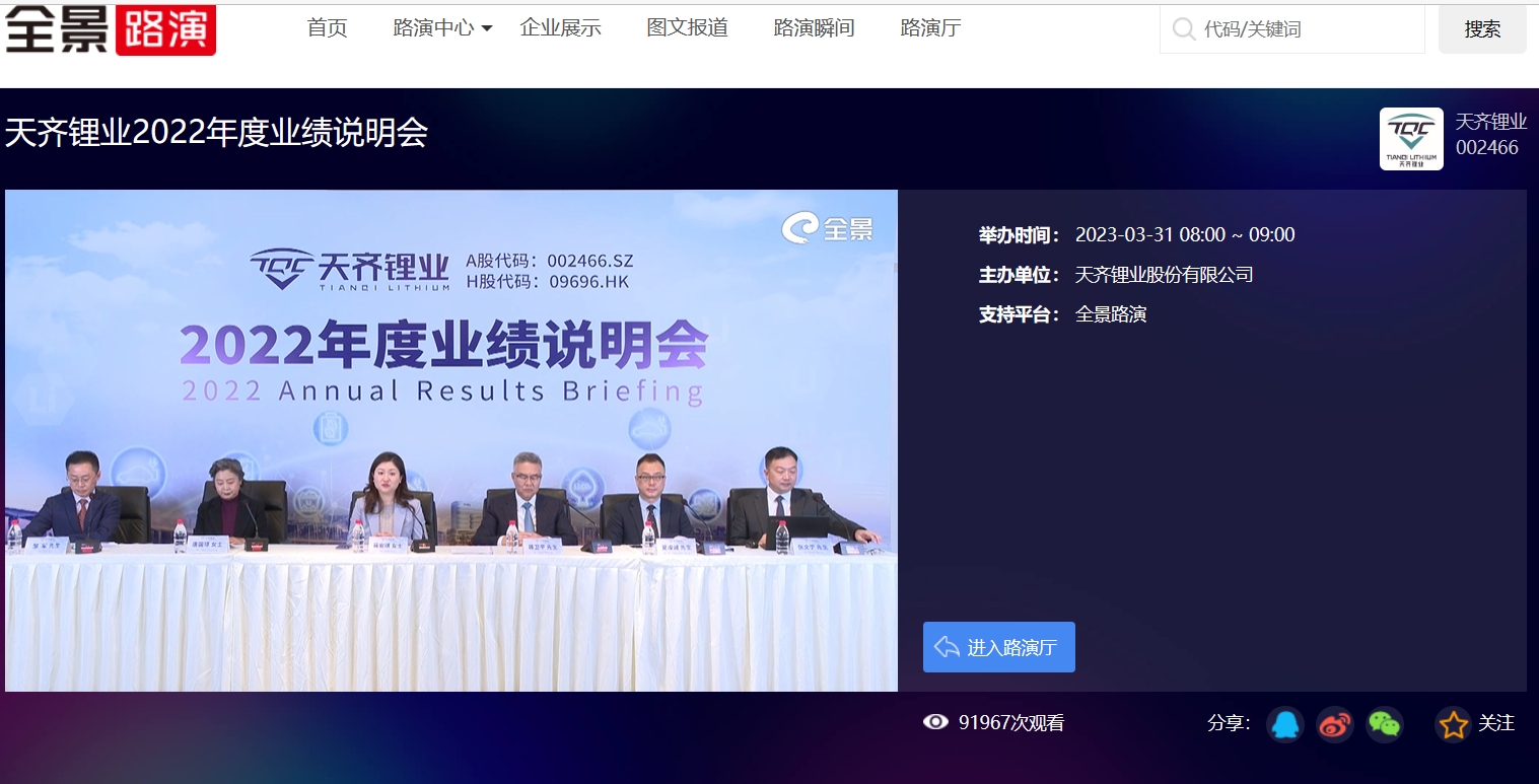 3月31日,天齐锂业(002466)2022年度业绩说明会在全景网成功举办。