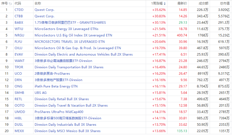 周内交投活跃的ETF还包括:3倍做多富时欧洲ETF $EURL 周涨13.41%,2倍看多每日巴西股票ETF $BRZU 周内涨超13%、2倍做多能源产业ETF $ERX 周内涨超12%。
