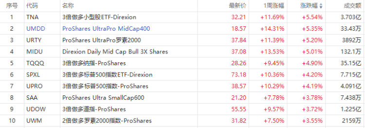 纳指、标普500指数等相关ETF延续上周涨势,3倍做多小型股ETF $TNA 周涨11.69%列股指涨幅榜第一;3倍做多纳指ETF $TQQQ 涨9.45%,3倍做多标普500指数ETF $UPRO 近一周涨10.29%,3倍做多道指ETF $UDOW 涨9.57%。