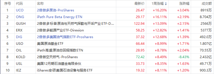 商品、能源ETF方面,本周涨幅居前的为2倍做多原油 $UCO 近一周涨幅16.2%,2倍做多标普与天然气探勘和开采产业ETF $GUSH 涨13.09%,2倍做多能源产业 $ERX 周涨12.82%, 2倍做多美国油气指数 $DIG z涨12.68%,美国原油基金ETF $USO 涨8.99%。
