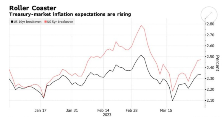投资者正在为通胀寻求保护,因为他们预计美联储将过早放弃维持物价稳定的努力,转而支维护金融稳定。利率交易员认为,银行业的动荡将导致美联储很快暂停长达一年的加息行动,随后将降息。在这样的背景下,通货膨胀可能会再度升温。过去几周,对通胀的担忧已经刺激了市场对美国通胀保值债券(TIPS)的需求。