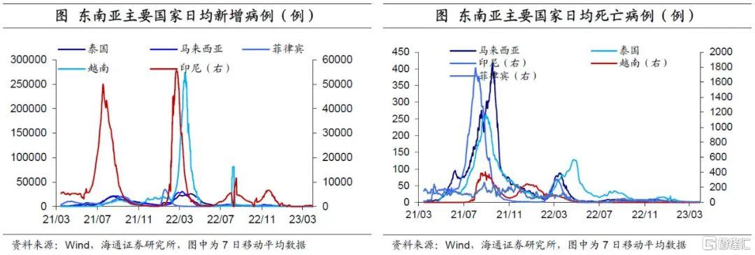 东南亚疫情有所反弹。从日均新增确诊病例数来看,截至3月31日,除泰国外,东南亚其他主要国家新增确诊病例均较上一周有所回升。其中,菲律宾上升幅度最大,为24.9%。新增死亡人数方面,泰国和马来西亚有所上升,其他国家均呈回落态势。
