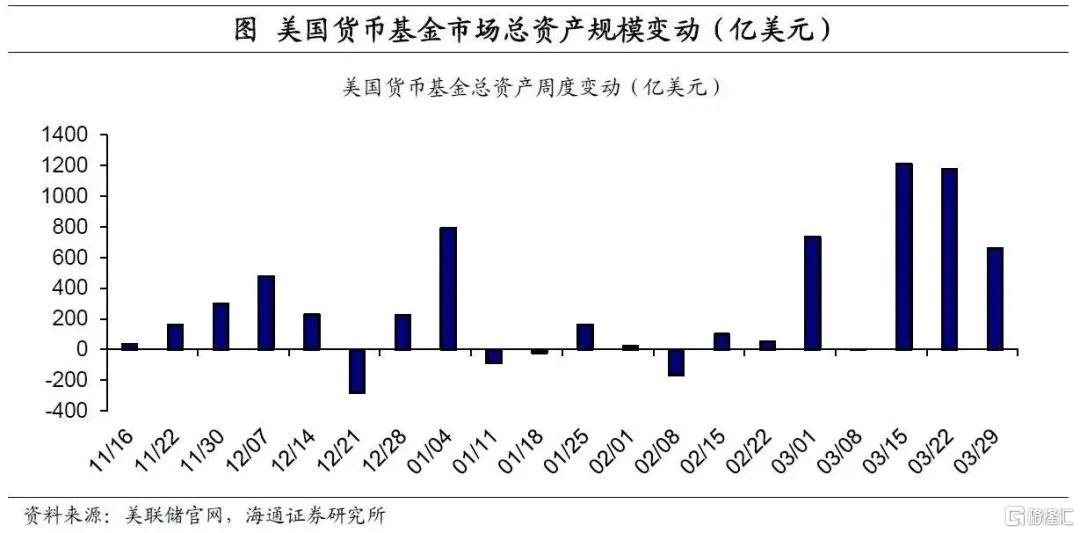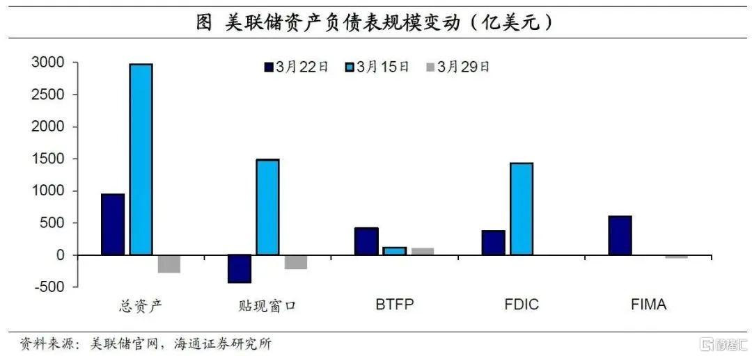 美联储:美联储资产负债表重回收缩。截至3月29日,当周美联储总资产回落至8.7万亿美元,较前一周减少了近300亿美元,主因贴现窗口使用继续下降,美联储资产负债表重回收缩。不过银行风险仍未完全消除。第一,商业银行存款流失仍存在;第二,货币基金市场仍在扩张。