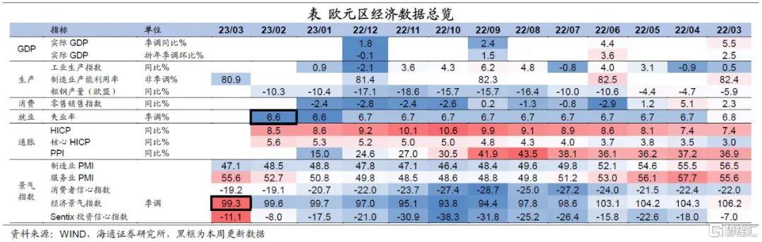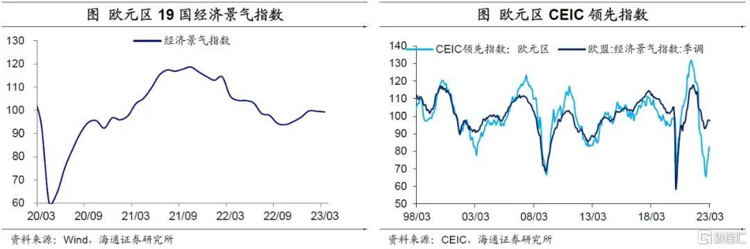景气指数小幅回落。3月欧元区19国经济景气指数为99.3,较2月回落0.3。自去年下半年以来,经济景气指数便呈现底部回升的趋势,或与能源价格回落有关。但整体来看,和疫情前水平(2019年12月为102.9)仍然还有一定距离。