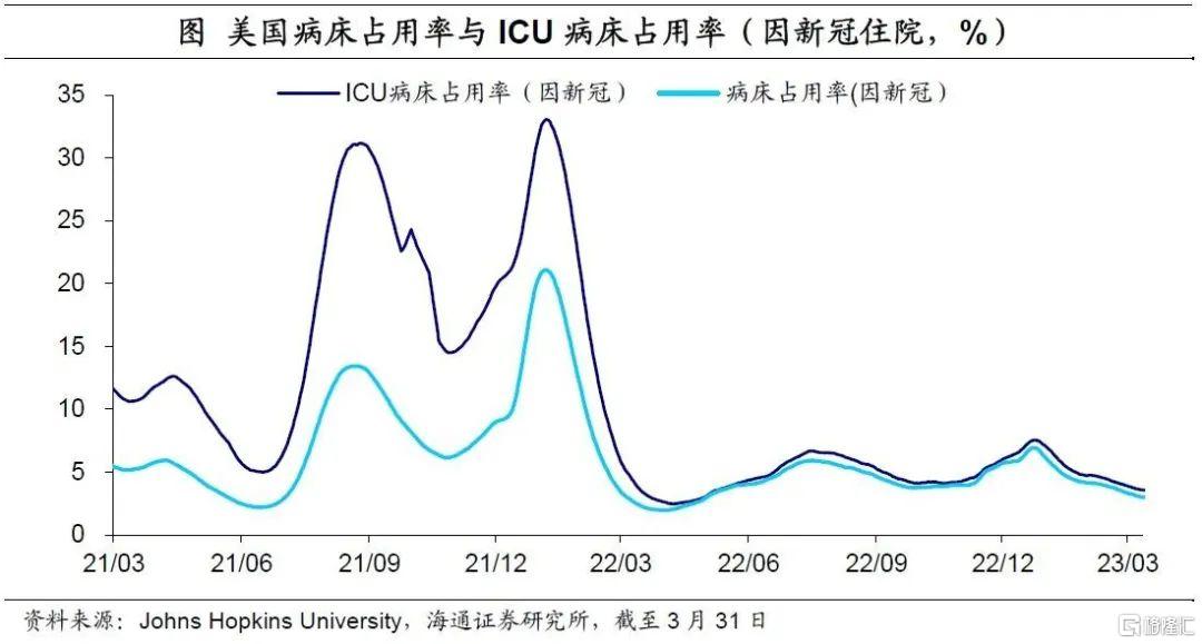 美国医疗负担进一步缓和,其中因新冠导致的住院与ICU占用率稳步下降。截至3月31日,美国病床占用率为76.1%,较上周下降0.1个百分点,其中因新冠导致的病床占用率占比稳定在2.9%。美国ICU占用率维持在73.7%,因新冠占用率为3.5%。整体来看,与新冠相关的医疗负担仍在低位。