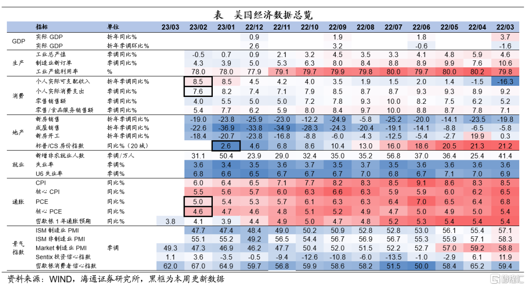 个人消费支出仍有韧性。2月美国个人消费支出同比增速为7.6%,较1月回落0.6个百分点,但仍处于相对高位。在收入高增以及居民仍有部分超额储蓄的支撑下,美国消费或还能维持一段时间的韧性。