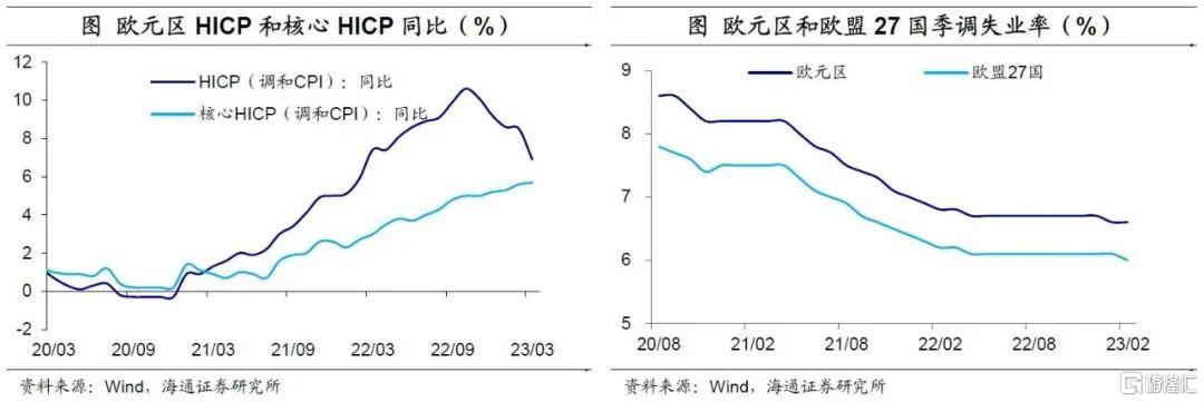 核心通胀持续上行。3月欧元区HICP同比增速为6.9%,较2月回落1.6个百分点,回落速度有所加快。但剔除能源和食品的核心HICP同比增速为5.7%,较2月进一步上升0.1个百分点,仍未有回落迹象。当前欧洲通胀压力或仍具有一定的普遍性,短期内核心通胀或仍将处于高位。