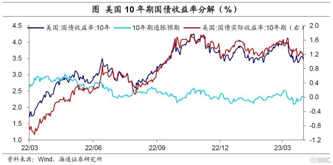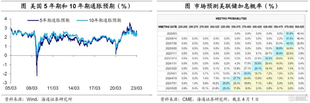 市场加息预期有所回升。在银行破产风波边际缓和,以及美联储多位官员强调降通胀仍需努力影响下,市场对美联储的加息预期有所回升。截至4月1日,CME预期美联储5月加息25BP的概率从11.8%上升到48.4%。预期年内降息100BP的概率已从上周的34%降至6.8%,不过当前市场仍预期年内有34.5%的概率降息50BP。