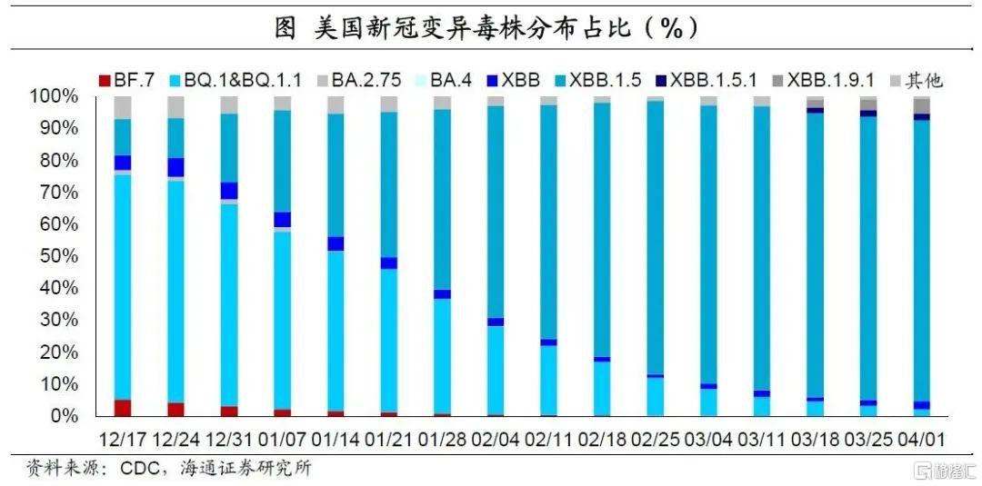 美国XBB.1.5感染比例小幅回落。美国CDC新冠检测数据显示,截至4月1日,奥密克戎变异株XBB.1.5的感染占比小幅回落至87.9%,而XBB.1.5.1与XBB.1.9.1的感染占比有所上升,分别为2.1%与4.6%。