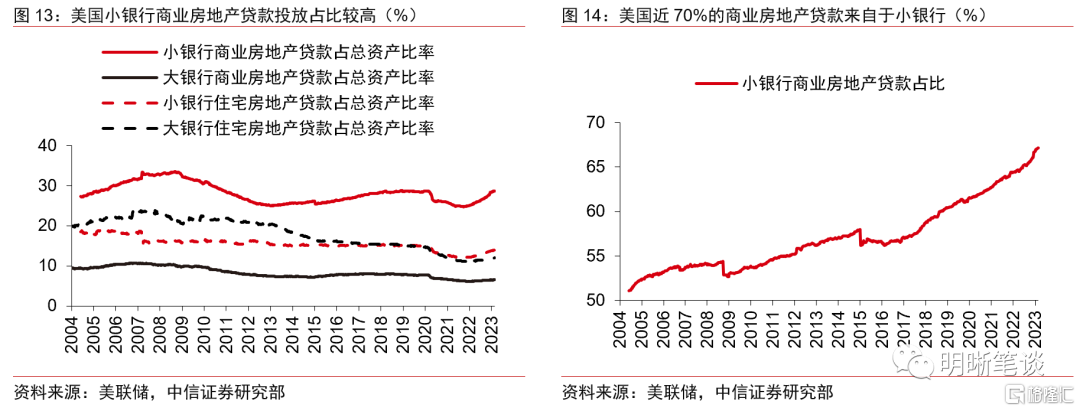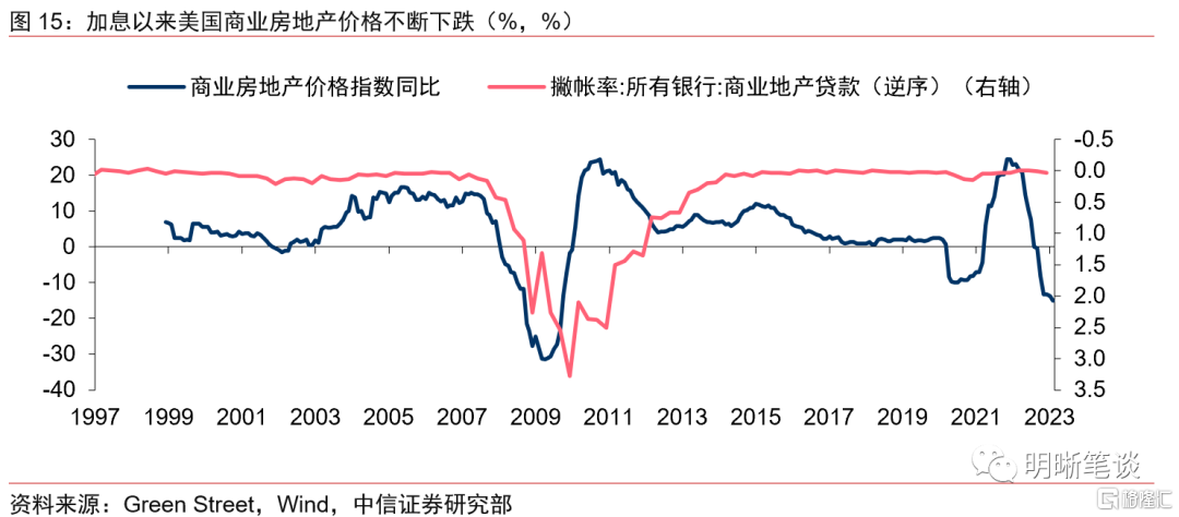 美国银行走出困境了吗?(1)美国银行将持续面临存款流失问题。由于美国仍处于货币紧缩的过程,未来美联储降息需等待较长一段时间,因而预计短期金融资产的高收益率会持续导致美国银行存款流出,尤其是声誉偏低的中小银行。由于贷款端利率较难快速大幅提升,若美国银行提升存款利率,则利润空间将被大幅压缩,因而美国银行面对存款流失较为无力。(2)美国中小银行商业房地产风险敞口较高,经济放缓背景下也埋下银行风险隐患。小银行对于商业房地产贷款的投放远高于住宅房地产,美国近70%的商业房地产贷款来自于小银行。而自加息以来,美国商业房地产市场不断降温,其价格不断下跌,写字楼空置率也有所上升。CRED IQ数据显示约有1620亿美元商业房地产贷款于2023年到期,到期规模为未来十年最高水平。在经济放缓、银行业贷款标准或进一步紧缩、商业房地产价值不断萎缩的情况下,未来美国银行资产端的商业房地产贷款风险令人担忧。