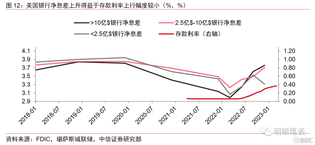 而美国银行面对存款流失较为无力,因为贷款端利率较难快速大幅提升,若提升存款利率,则其利润空间将被大幅压缩。虽然美国银行净息差整体自2021年呈现上升趋势(由于存款利率上行幅度有限),但是若银行提升存款利率以避免存款流失加剧,则银行利润空间将趋于有限,并且当前小银行的净息差已有所恶化。