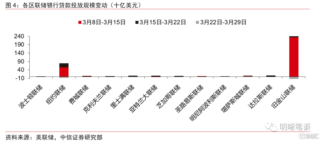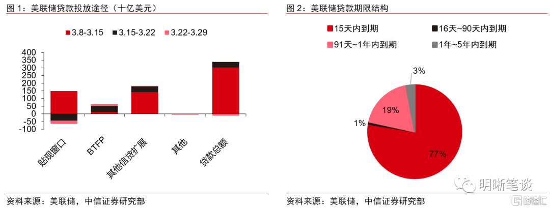 虽然美联储快速释放了较大规模流动性,但美联储提供的主要为短期流动性,因而扩表并不意味着美联储货币政策取向的转变。美联储贷款均为5年内,77%以上美联储贷款集中在15天以内,97%以上为1年以内。虽然一些流动性工具可以滚续,但这种短期流动性的释放与QE直接购买证券(释放长期流动性)存在本质区别,美联储短期流动性释放可以在风险事件过后的中短期内较快收回,因而此轮释放流动性并不意味着美联储紧缩货币取向的改变。
