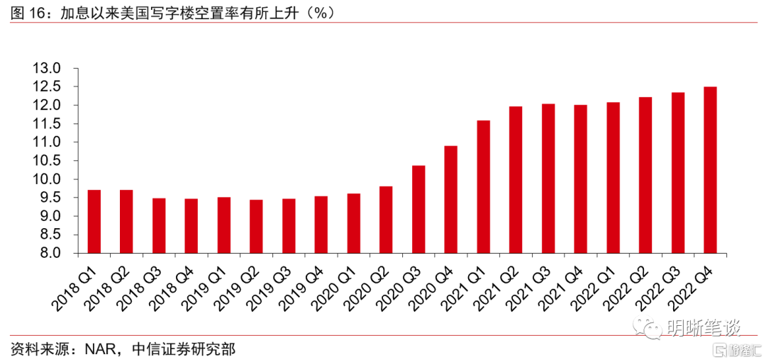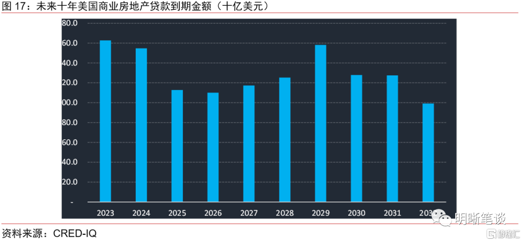 美国中小银行商业房地产风险敞口较高,在经济放缓的背景下其风险敞口为银行的风险隐患。小银行对于商业房地产贷款的投放远高于住宅房地产,美国近70%的商业房地产贷款来自于小银行。而自加息以来,美国商业房地产市场不断降温,其价格不断下跌,写字楼空置率也有所上升。CRED IQ数据显示约有1620亿美元商业房地产贷款于2023年到期,到期规模为未来十年最高水平。在经济放缓、银行业贷款标准或进一步紧缩、商业房地产价值不断萎缩的情况下,未来美国银行资产端的商业房地产贷款风险令人担忧。