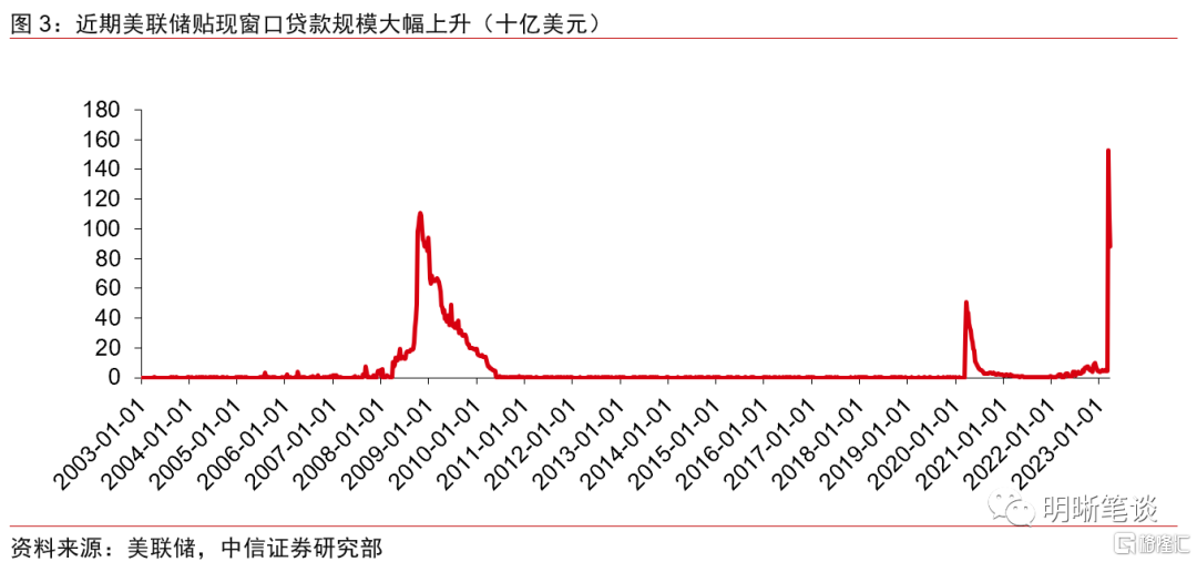 美联储通过贴现窗口以及银行定期融资计划等工具向市场投放了大规模的流动性。由于硅谷银行、签名银行等风险事件,过去三周,美联储资产负债表扩大了3636.59亿美元,贷款规模扩大了3274.58亿美元,其中流动性主要通过贴现窗口、银行定期融资计划(BTFP)以及其他信贷扩展流向美国银行体系。美联储通过“其他信贷扩展”向FDIC释放流动性,为其处理硅谷银行以及签名银行相关事项提供过桥贷款。此次贴现窗口借款的最高规模甚至高于2008年金融危机峰值,反映出此次危机美联储给予的流动性较为宽裕。