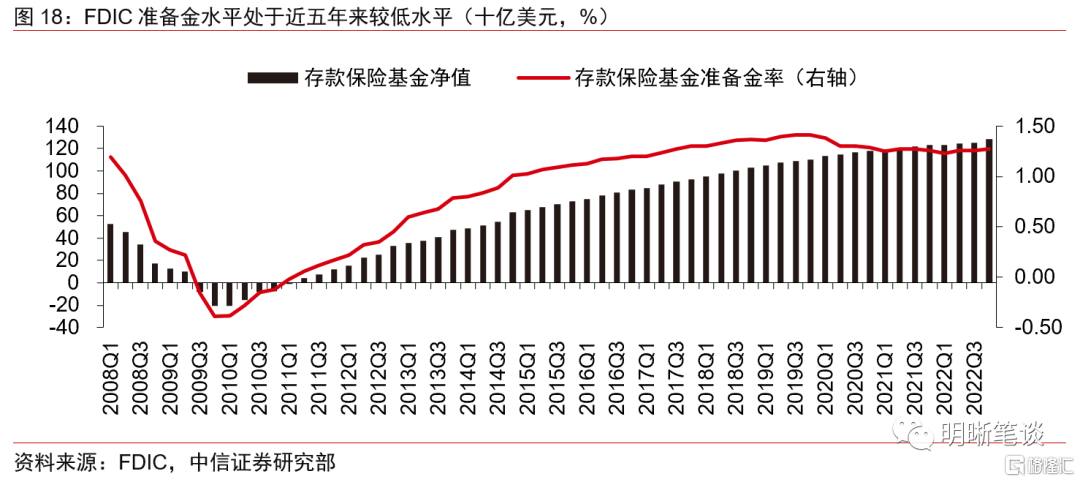 此外,FDIC的储备水平也相对较低,FDIC对于美国存款的保护实质上较为有限。截至2022年12月,FDIC准备金率仅为1.27%左右(即存款保险基金占受保护存款的1.27%),存款保险基金仅占美国国内存款总额的0.7%。存款保险基金规模(1282亿美元)甚至低于硅谷银行存款总规模(1731亿美元),处理硅谷银行以及签名银行后续事项预计将一定程度依靠美联储贷款。另外,虽然FDIC可以向财政部借款,但这也意味着纳税人的资金将受到损失,因而FDIC向财政部借款以增加资金途径的可用性存在一定不确定性。