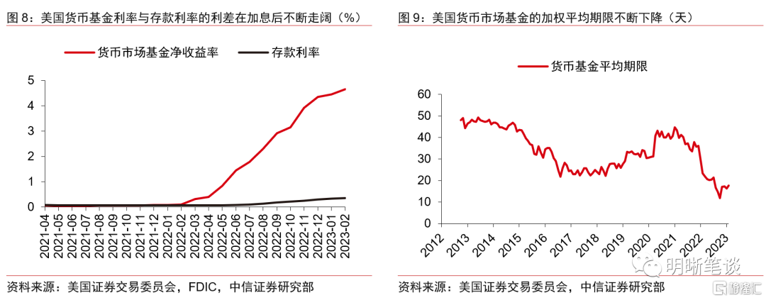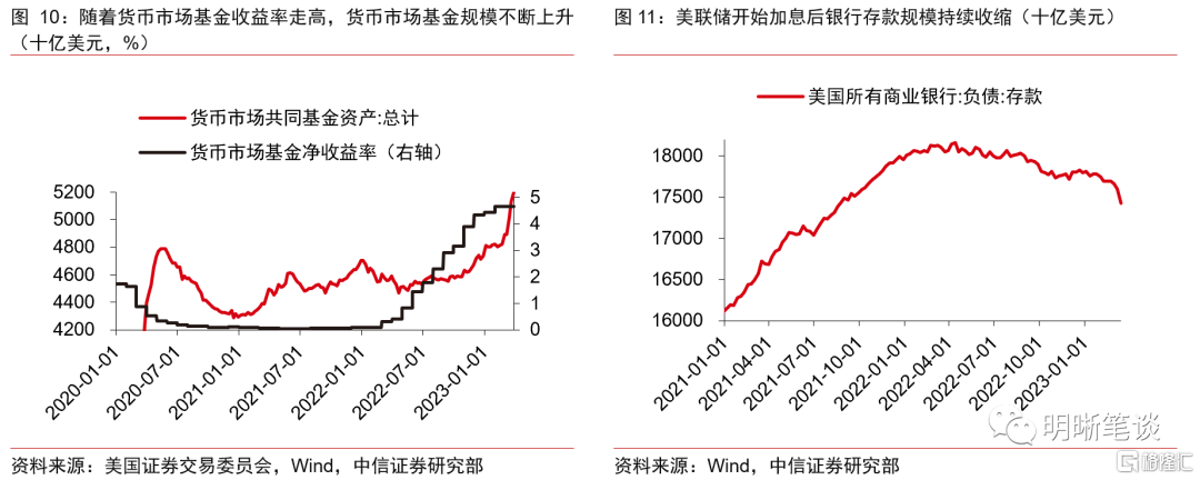 由于美国仍处于货币紧缩的过程,未来美联储降息需等待较长一段时间,因而预计短期金融资产的高收益率会持续导致美国银行存款流出,尤其是声誉偏低的中小银行。在加息初期,货币市场基金利率与存款利率的差距并不明显,因而在加息初期存款向货币基金、国债等短期资产转移迹象并不明显。但在美联储激进加息下,货币市场基金利率与存款利率的利差不断走阔,因而货币基金规模自去年下半年开始激增,存款规模收缩速度也就此开始加速。由于未来美联储预计将维持高利率一段时间,美国银行将持续面临较严峻的存款流失问题。