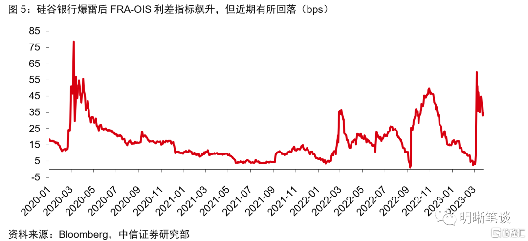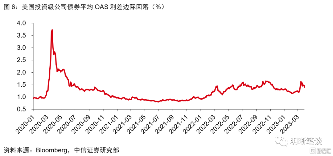 流动性指标显示恐慌情绪以及流动性压力有所减弱,但仍处于流动性偏紧张状态。FRA-OIS利差为美国三个月远期利率与隔夜指数掉期利率被视为银行业流动性压力指标,在硅谷银行爆雷后,该指标一度飙升至59.8,接近2020年疫情冲击的峰值,但近期该指标有所回落。同时,美国投资级公司债券平均OAS利差边际也呈现回落迹象,近期已回落至150bps以下。