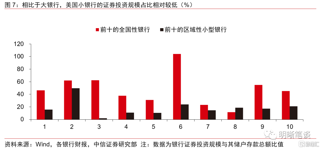 但是也需注意BTFP的合格抵押品范围偏窄,BTFP对于流动性风险更高的小银行的帮助相较于大银行更为有限。BTFP的合格抵押品为美联储在公开市场操作中可以购买的金融资产,主要为国债与MBS。但当前处于流动性风险中心的中小银行大多并没有像硅谷银行那样极端地持有较高比例证券投资,中小银行往往较大银行持有更低占比的证券投资、更高占比的贷款投放,因而抵押品标准较为严格一定程度会导致中小银行使用BTFP的空间远低于大银行。