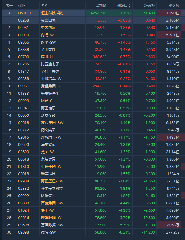 科网股多数走弱,哔哩哔哩-W跌近6%,消息面上,多位UP主密集地公开宣布暂停更新;快手-W跌超4%;阿里巴巴-SW跌近2%;美团-W,京东集团-SW等跌超1%。