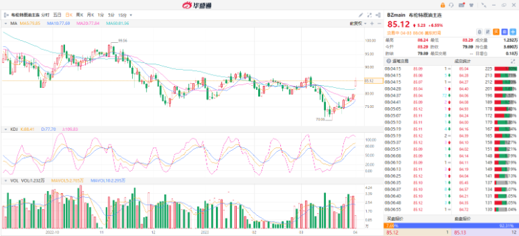 当地时间周日,石油输出国组织的多个成员国宣布,各国将从5月开始削减石油供应量,总削减幅度超100万桶/日。随后,俄罗斯也宣布将自愿减产50万桶/日。各国累计总减产幅度超过160万桶/日。截至发稿,布伦特原油期货主连涨超6%,报85.12美元。