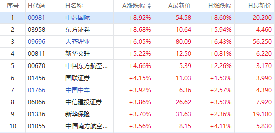 截至发稿,中芯国际A股涨8.92%,H股现涨8.6%,东方证券A股涨8.68%,H股现涨5.94%,天齐锂业A股涨6.05%,H股现涨6.43%。