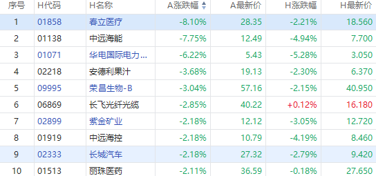 春立医疗A股跌8.1%,H股现跌2.21%,中远海能A股跌7.75%,H股现跌4.74%,华电国际电力A股跌6.22%,H股现跌5.29%。