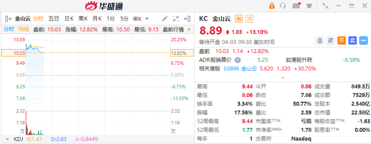金山云盘前升超12%,报10.03美元。公司预计2023年第一季度总收入将介于18.5亿元至20.5亿元。