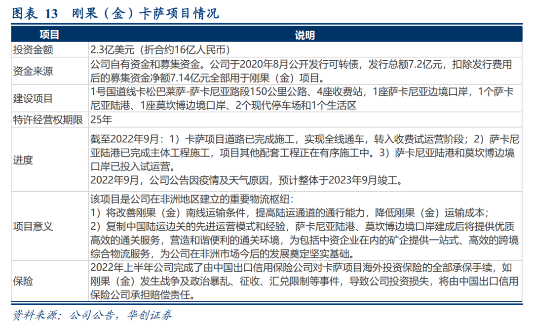 23年3月,公司公告非洲第二个重要项目,主要包括修复和改造一条 219.4 公里公路和一个陆路口岸等。该项目为与紫金矿业共同投资、建设、运营,建成后,公司将拥有刚果(金)铜钴矿带两条运输大通道,为中资企业的矿产资源开采提供运输保障,同时能够为公司带来可观收益。并且值得关注的是,该项目可视为为进一步打开与紫金在非洲市场的合作空间奠定基础。