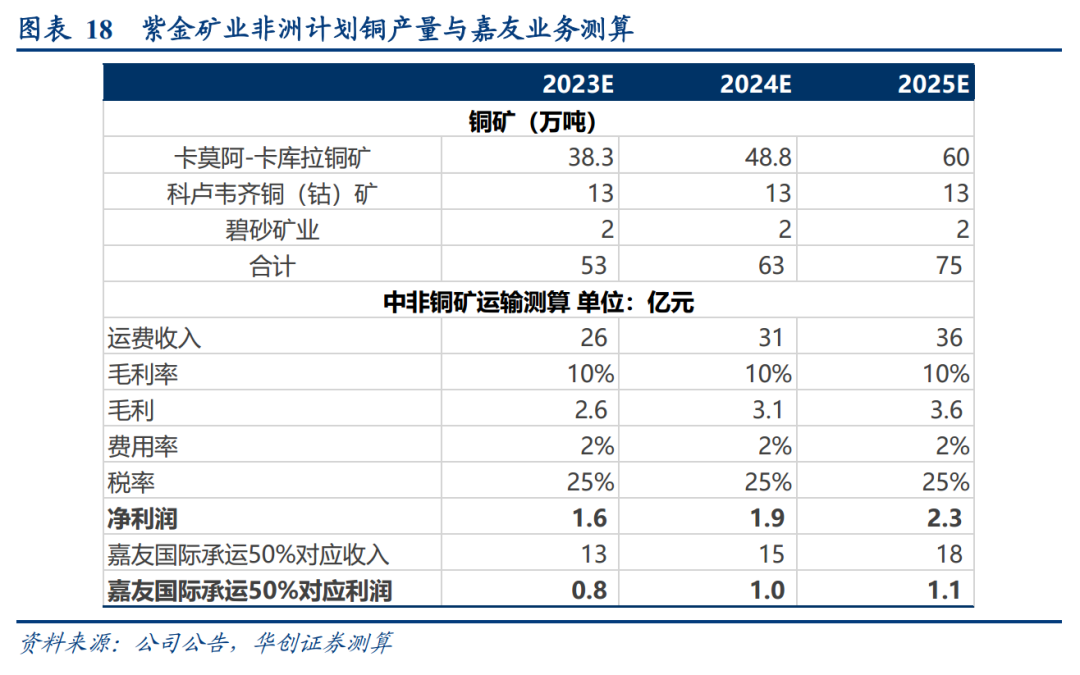 按照1美元=6.9人民币汇率计算,23-25年嘉友国际为紫金矿业运输铜矿收入(运费)分别为13、15、18亿元,对应利润分别为0.8、1、1.1亿元。
