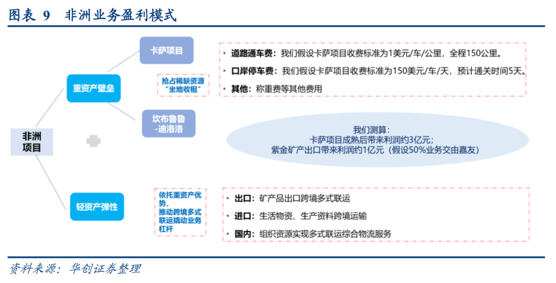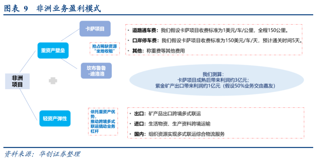 再升级则是公司首次获取道路+口岸特许经营权,资产壁垒的独占性更强,未来公司可以依托卡萨道路与陆港项目形成的优势,在非洲市场跨境多式联运综合物流领域形成具有影响力的地位。