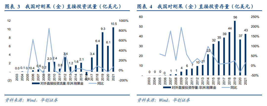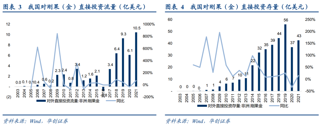 我国对刚果(金)直接投资流量看:2009-2015年直接投资额在1-3.5亿美元区间,自2018年开始我国在刚果(金)直接投资金额实现大幅跃升,2018-2021年直接投资额均超过6亿美元;2021年直接投资10.5亿美元,创历史新高。