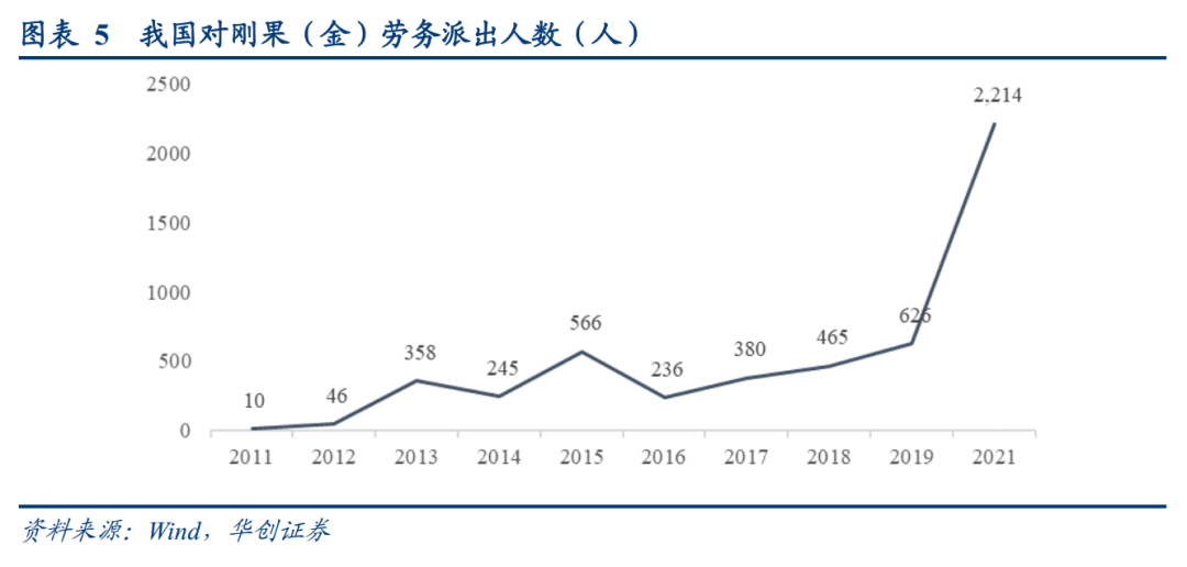 我国对刚果(金)劳务派出人数看:2021年为2214人,是2019年的3.5倍。