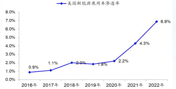 美国新能源汽车的增长更为迅猛。数据显示,2022年美国新能源乘用车销量98.6万辆,同比增长49.2%,渗透率达6.9%。2023年1月、2月,美国新能源乘用车销量分别达到 10.3万辆和11万辆,同比分别增长66.1%和62.4%,单月渗透率创历史新高,2月单月渗透率已达9.5%。