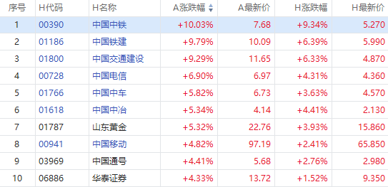 截至A股收盘,AH股涨幅前10如下: