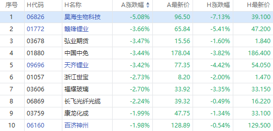 昊海生物科技A股跌5.08%,H股现跌7.13%,赣锋锂业A股跌3.66%,H股现跌5.41%,弘业期货A股跌3.47%,H股现跌1.6%。