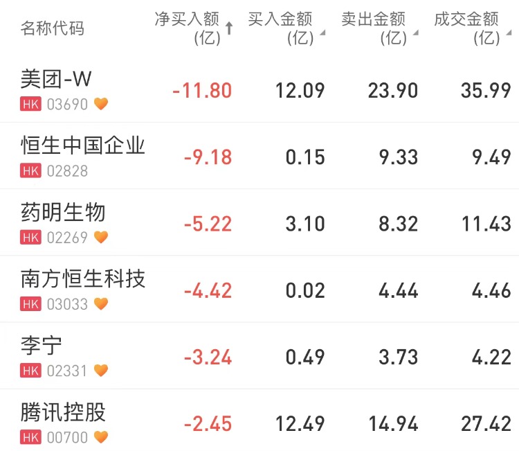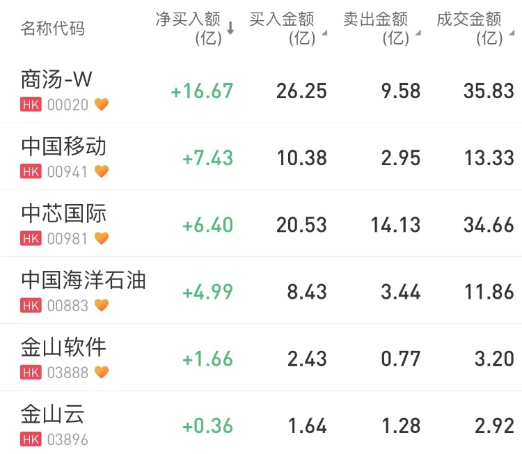 商汤-W、中国移动、中芯国际分别获南向资金净买入16.67亿港元、7.43亿港元、6.4亿港元;美团-W净卖出额居首,金额为11.8亿港元。